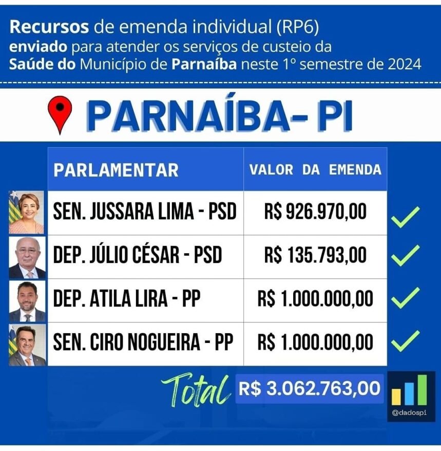 A deputada Gracinha MS, que também ocupa o cargo de prefeita de fato em Parnaíba, nos últimos meses, empenhada em dizer que só ela, a mãe e o pai dela trabalham e amam Parnaíba, tem xingado muito os deputados e senadores do Piauí, dizendo que eles não mandam recursos para Parnaíba. Que eles odeiam a cidade. Mas quando mandam dinheiro, ela cala, não agradece e ainda se dá ao luxo de não dizer para a população, como esses recursos estão sendo ou vão ser aplicados. Como se vê acima, mais de 3 milhões foram enviados no 1º semestre. E não foram apenas os parlamentares do partido dela (Ciro e Átila) que enviaram. O deputado Júlio César e a senadora Jussara Lima, são do PSD, o mesmo partido do pré-candidato a prefeito, Zé Hamilton.