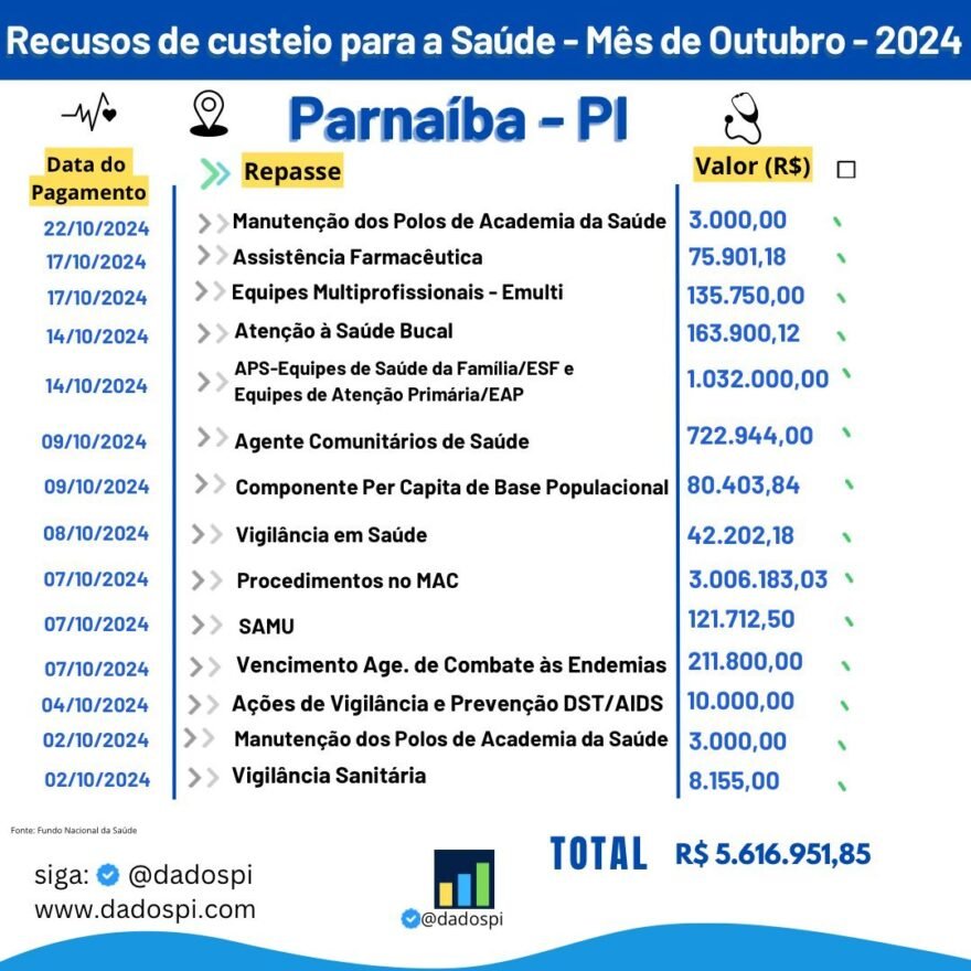 Mais de 5 milhões e meio de reais. Foi esse o montante de recursos federais que a Prefeitura de Parnaíba recebeu no mês de outubro.