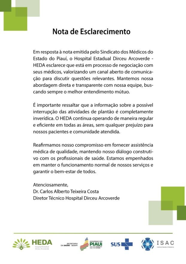 Com respeito à nota emitida pelo Sindicato dos Médicos do Piauí, dando conta de suposta paralisação de médicos no Hospital Dirceu- HEDA, o diretor técnico daquele hospital, Carlos Teixeira, emitiu a seguinte Nota de Esclarecimento: