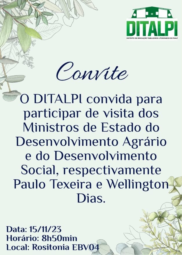 Distrito de Irrigação Tabuleiros Litorâneos recebe visita de ministros nesta quarta-feira(15) Posted by Bernardo Silva on 14 de novembro de 2023 in Cidade Cidade