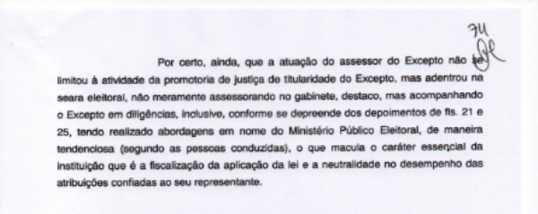Na decisão o magistrado destaca “que se afigura prejudicial à imparcialidade exigida no mister do Excepto a existência de uma clara ligação entre uma pessoa que possui manifesto interesse político-partidário com o representante ministerial, não meramente pela íntima relação entre ambos (que foge da esfera da seara profissional), sendo equiparada a de ‘pai e filho’ (…), mas especialmente, pelo fato de que o assessor diretamente auxiliou e atuou em atividades fiscalizatórias durante o pleito eleitoral, quando não tinha a devida imparcialidade ou mesmo atribuição para tanto. Observo, ainda, que as atividades desempenhadas pelo assessor ministerial, por ensejo destas diligências, poderão ser melhor aquilatadas quando da análise do relatório do IP encaminhado pela Polícia Federal”.