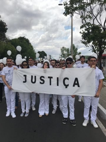 Segurando cartazes pedindo justiça, familiares e amigos encerraram a caminhada em frente a UFPI, onde foi realizado um abraço coletivo e após orações foram soltos balões brancos.