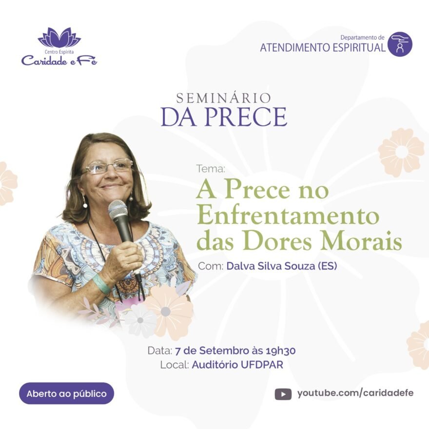 O Departamento de Atendimento Espiritual do Centro Espírita Caridade e Fé, realizará no dia 07 de setembro, às 19h30min, no auditório da Universidade Federal do Delta do Parnaíba, o Seminário da Prece, que tem como tema, “A Prece no Enfrentamento das dores morais”, tendo como ministrante, Dalva Silva Souza (ES).