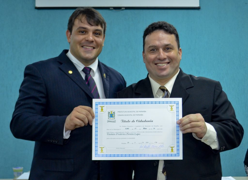O empresário Gustavo Frederico Pereira Lopes foi condecorado com o Título de Cidadão Parnaibano, entregue durante solenidade na Câmara Municipal de Parnaíba na última quinta-feira (29). A proposição foi de autoria do vereador André Neves, que concedeu a honraria ao homenageado.