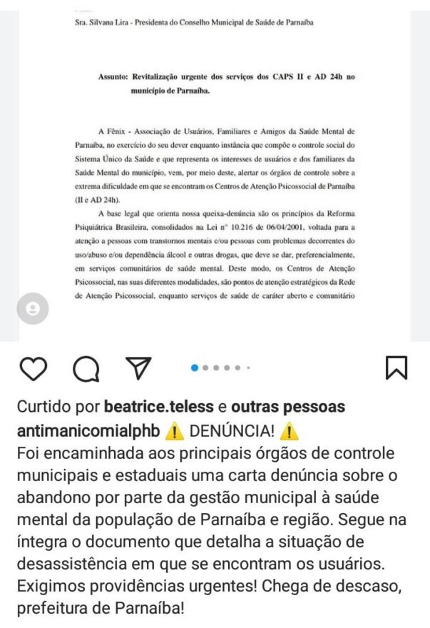 A Fênix – Associação de Usuários, Familiares e Amigos da Saúde Mental de Parnaíba, apoiada por entidades sindicais e coletivos de movimentos sociais, alertam os órgãos de controle (Ministério Público do Piauí, Gerência Estadual de Saúde Mental do Piauí, Conselhos Estadual de Saúde e Conselho Municipal de Saúde de Parnaíba, CRM, CRP, COREN, CREFITO e CRESS) sobre as dificuldades em que se encontram os Centros de Atenção Psicossocial de Parnaíba (II e AD 24h). O descaso nos serviços tem acarretado desassistência aos usuários já assistidos, e falta de acolhimento e retaguarda para as necessidades em saúde mental da população.