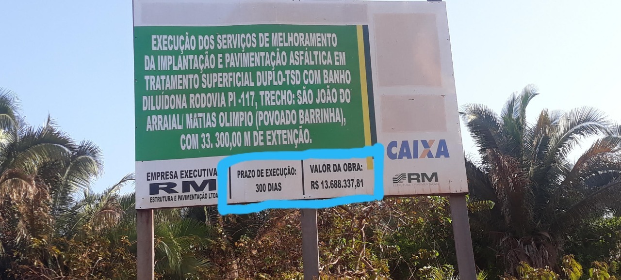 Uma placa anuncia a construção de uma estrada entre as cidade de São João do Arraial de Matias Olímpio, no Norte do Piauí, com conclusão para 300 dias.