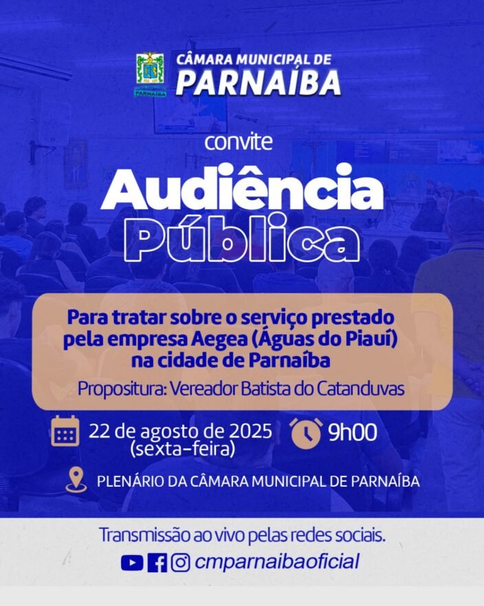O objetivo seria tratar, buscando soluções, dos problemas e dos serviços prestados pela empresa Águas do Piauí (Aegea), que substitui a Agespisa, vendida pelo governo do Estado, após sucateá-la.  Mas nenhum representante da empresa se fez presente, o que seria motivo de sobra para a suspenção da tal audiência, proposta pelo vereador Batista do Catanduvas. Considere-se que sequer a metade dos vereadores se encontrava presente.