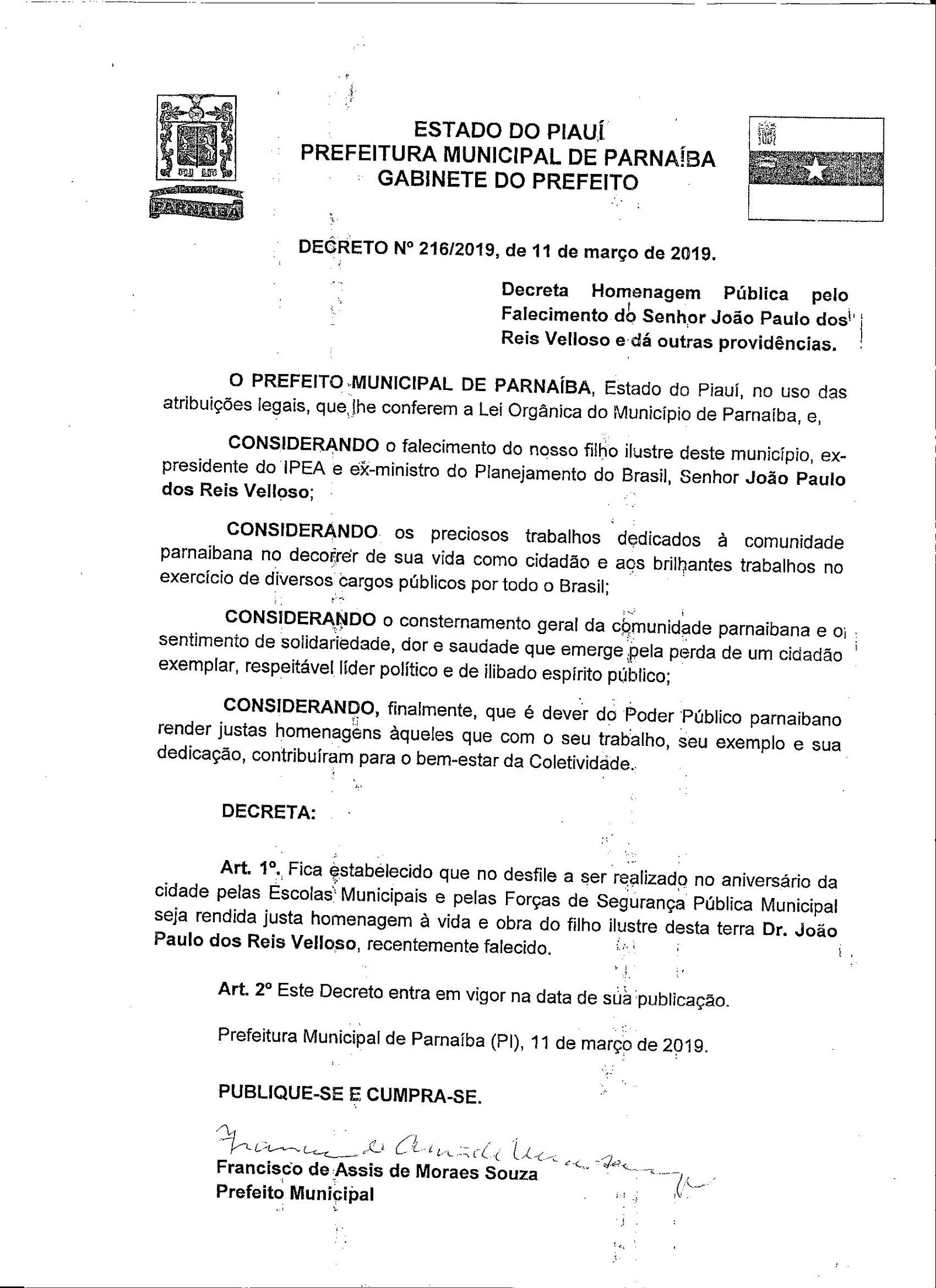 O Prefeito de Parnaíba, Mão Santa, assinou decreto, na manhã desta terça-feira, determinando que nos desfiles cívicos a serem realizados no aniversário de Parnaíba, pelas Escolas Municipais e Forças de Segurança do Município, 14 de agosto, “seja feita uma homenagem justa à vida e obra do filho ilustre desta terra, Dr. João Paulo dos Reis Velloso, falecido recentemente”.