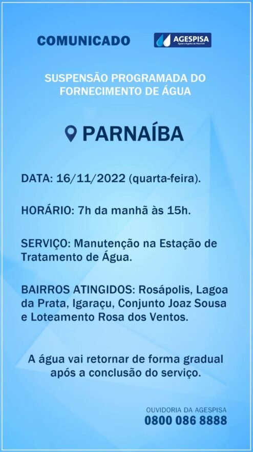 Falta de água em Parnaíba: Agespisa explica Posted by Bernardo Silva on 16 de novembro de 2022 in Diversos Diversos