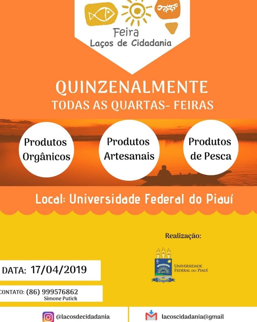 O Projeto Laços de Cidadania vai ter o ponta pé inicial no dia 17 de abril em frente ao auditório central da Universidade Federal do Piauí, campus Ministro Reis Velloso. A Feira acontecerá quinzenalmente as quartas-feiras.