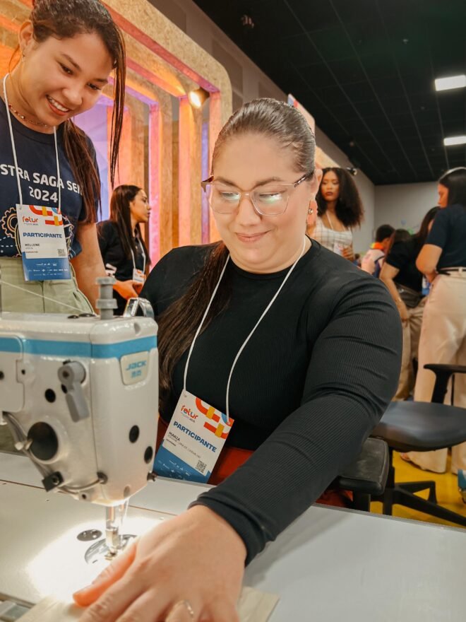 No SENAI, a experiência de uma aula prática de costura levou centenas de visitantes ao estande.