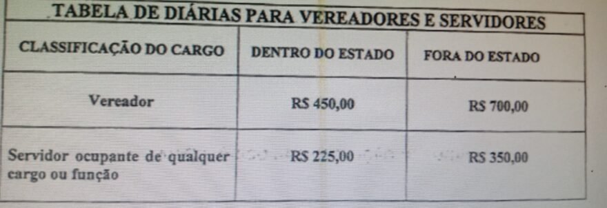O projeto de lei do vereador Fernando Gomes fez os valores baixarem quase pela metade, embora ainda permanecessem altos, considerando que até mesmo quando o vereador viaja, sob a justificativa de que vai “fazer” um curso, há comprovações de que nem sempre isso é verdade. Às vezes não há viagem alguma e, quando existe um curso, geralmente é meio enrolado e, na volta, o vereador, conforme exige a lei, não explica como foi o tal curso. Atualmente os valores das diárias são os seguinte:
