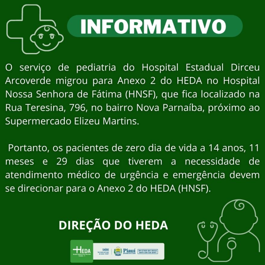 Hospital Estadual Dirceu Arcoverde (HEDA) informa: Posted by Bernardo Silva on 21 de outubro de 2022 in Cidade Cidade