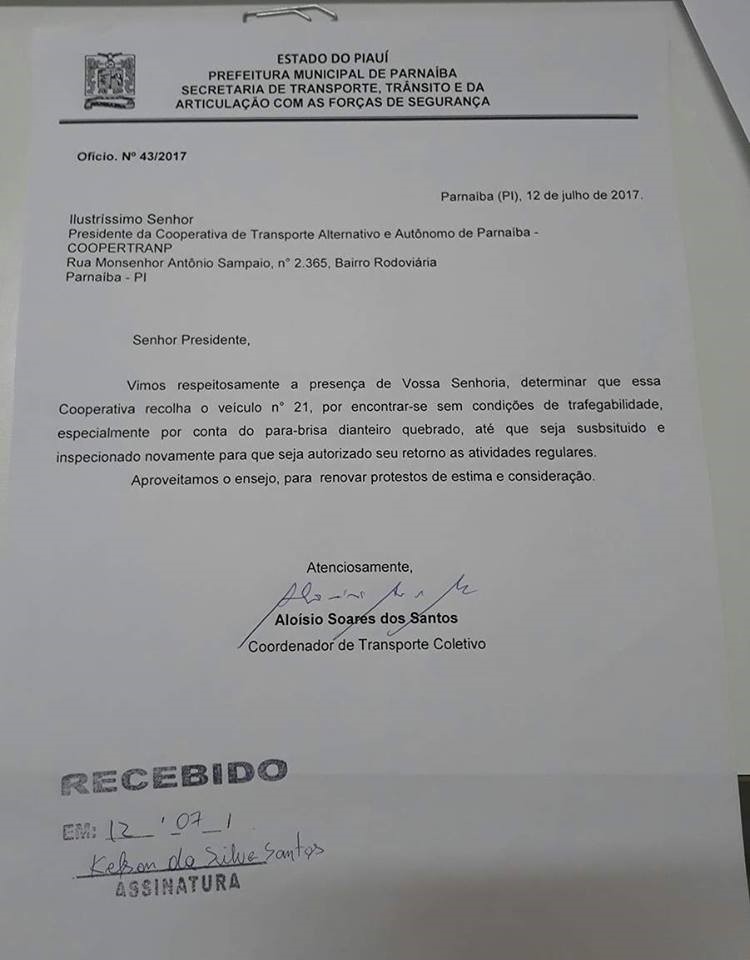 No dia 20 de junho e posteriormente, na data de 06 de julho, fiscais da Secretaria Municipal de Trânsito, Transportes e Articulação com as Forças de Segurança fizeram fiscalizações nos ônibus e micro-ônibus urbanos da Coopertranp, empresa permissionária que presta serviço nos bairros de Parnaíba. De acordo com o secretário de Trânsito, Maurício Machado, a primeira inspeção foi educativa, como forma de checar as condições dos veículos e orientar a direção da empresa a se adequar aos requisitos de segurança obrigatórios.