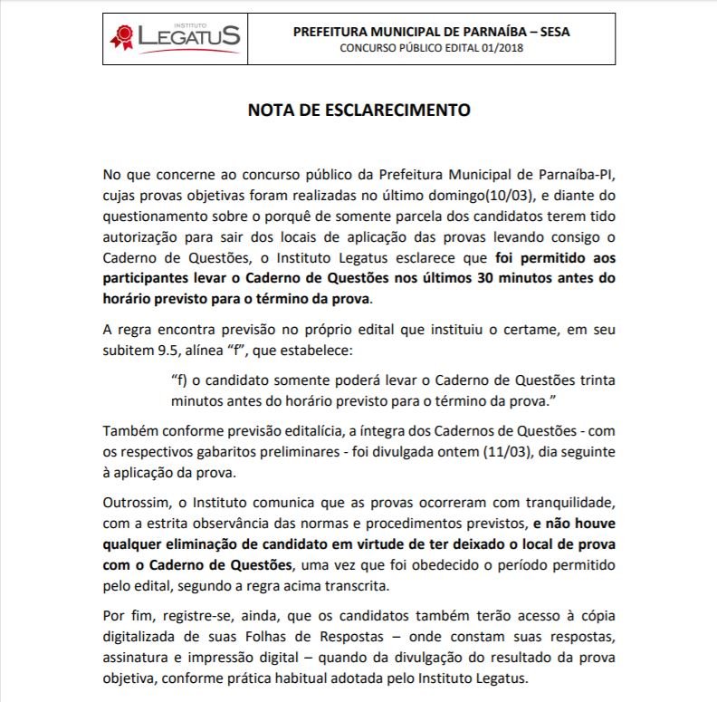 Segundo Nota de Esclarecimento do Instituto Legatus, nenhum candidato do concurso público da Prefeitura Municipal de Parnaíba‐PI, foi eliminado em virtude de ter levado o caderno de provas objetivas que foram realizadas no último domingo (10/03), desde que obedecido o prazo de meia hora antes da previsão do término da aplicação da prova conforme regra prevista no edital que instituiu o certame, em seu subitem 9.5, alínea “f”, que estabelece: “f) o candidato somente poderá levar o Caderno de Questões trinta minutos antes do horário previsto para o término da prova.”