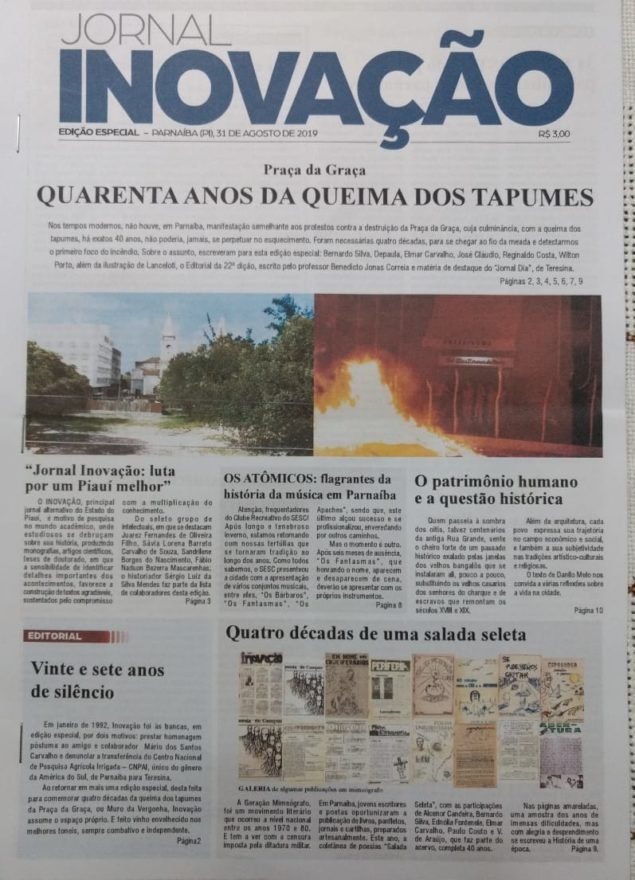 O Jornal “Inovação”, que fez história em Parnaíba nos anos 70/80 e deixou saudades em seus leitores, estará de volta neste sábado, em edição especial, comemorativa dos 40 anos da queima dos tapumes da Praça da Graça, episódio marcante de um grupo de estudantes que resolveram exigir, de forma mais radical, que o prefeito da época, jorna,lista Batista Silva, devolvesse reconstruída a Praça da Graça, que havia sido totalmente destruída para reforma e abandonada, encontrando-se cercada de tapumes, prejudicando o trânsito e enfeiando a área central mais importante da cidade. Os estudantes tocaram foto nos tapumes, desencadeando, a partir daí, uma série de outros episódios estando o jornal Inovação no centro de tudo.
