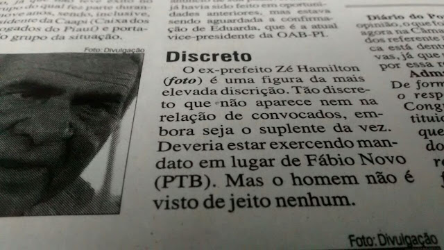 Um jornal da capital divulgou este final de semana a notinha acima, que leva a todos nós, humildes eleitores, à conclusão de que o ex-prefeito de Parnaíba não está nem aí para coisa alguma. Está na Assembleia Legislativa feito o jabuti colocado em cima da árvore por alguém. E este alguém foi Wellington Dias, que tenta governar o Piauí com a mesma desfaçatez que o caracterizou nos dois primeiros mandatos. Faz um governo para “compadres” e correligionários, em cima de mentiras, tentando passar para a opinião pública a imagem de bom moço. Bem ao estilo dos petistas cujo modus operandi é do conhecimento geral.