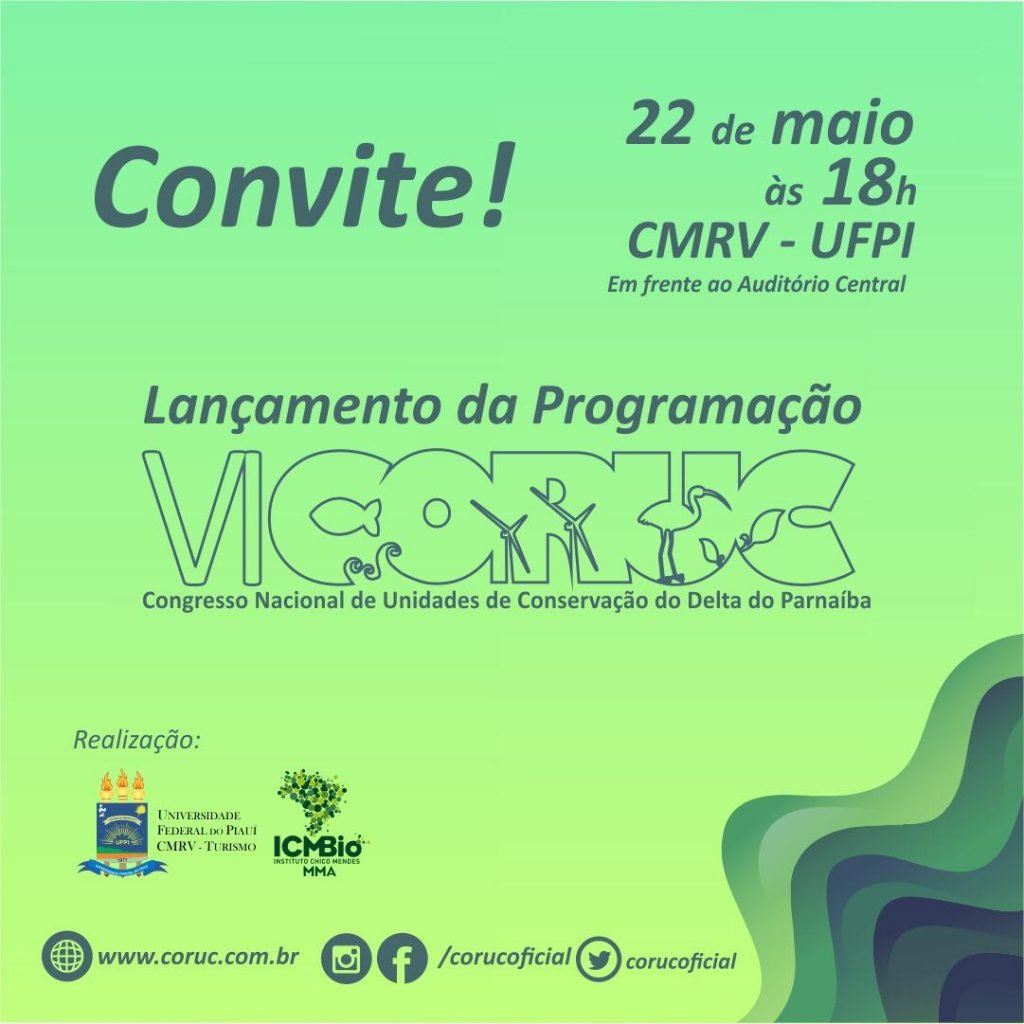 A Comissão Organizadora do VI Congresso Nacional de Unidades de Conservação do Delta do Parnaíba (CORUC) tem a honra de convidar a Vossa Senhoria a participar da Cerimônia de Lançamento da Programação de um dos maiores eventos de Unidades de Conservação do Brasil. Na sua VI edição o evento tem como temática: “Áreas de proteção ambiental e as possíveis transformações do espaço”.