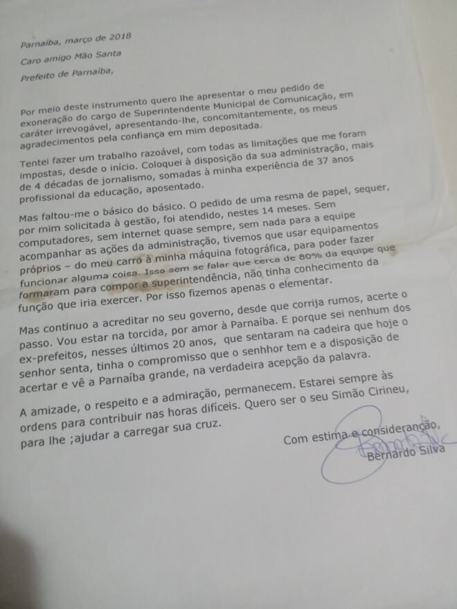 Não, não vou baixar a cabeça para a súcia que o Mão Santa (o velho caquético) paga, com dinheiro público, para tentar me intimidar. Sim, o Mão Santa que me convidou para fazer o programa eleitoral dele, em 2016, porque ninguém queria, por ele ter um tempo no rádio e Tv de apenas 35 segundo. Eu aceitei e fiz. Ele foi vitorioso. Depois, convidou-me para ser superintendente de comunicação do município, mas não me deu oportunidade de trabalho, conforme narrei em carta de demissão, pouco mais de um ano depois da posse. Eu sonhava em fazer um grande trabalho, mas fui tolhido porque tudo no governo deveria girar em torno da sua pessoa, da Gracinha e da dona Adalgisa. Portanto, não acho que estou comentando nenhuma ingratidão em ser oposição a este governo de mentira. Veja minha carta de demissão, de março de 2018.