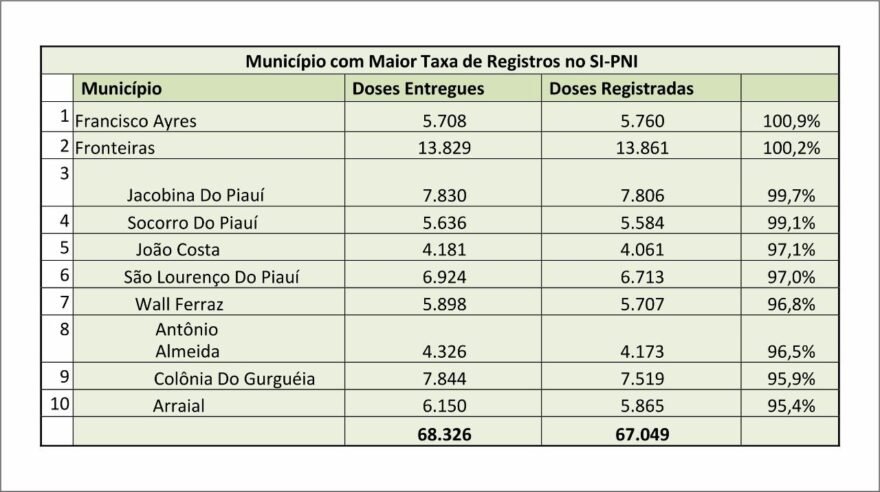 Já as cidades que mais inseriram suas informações sobre as doses aplicadas no SI-PNI são: Francisco Ayres, Fronteiras, Jacobina do Piauí, Socorro do Piauí, João Costa, São Lourenço do Piauí, Wall Ferraz, Antônio Almeida,Colônia do Gurguéia e Arraial.