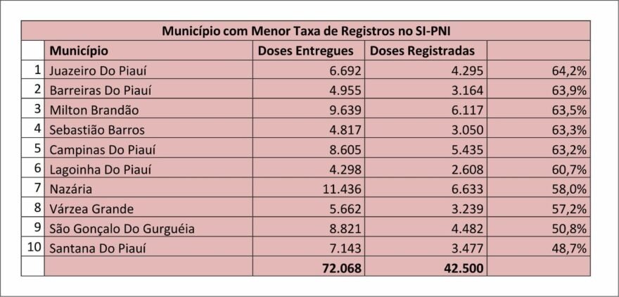 Levantamento da Coordenação de Imunização contra a Covid-19, da Secretaria de Estado da Saúde (Sesapi), aponta os municípios do Piauí que menos registram doses de vacinas no Sistema de Informação do Plano Nacional de Imunização (SI-PNI).