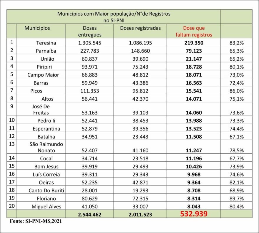 Quando comparado com o tamanho da população a capital Teresina é a que consta com o maior número de vacinas a serem cadastradas no sistema. A cidade recebeu 1.305.545 de doses, e até o momento, cadastrou 1.086.195, restando 219.350 doses em aberto. Logo em seguida estão entre os municípios com o maior número de doses a contabilizar, por possuírem um maior número de habitantes, as cidades de: Parnaíba, União, Piripiri, Campo Maior, Barras, Picos, Altos, José de Freitas, Pedro II, Esperantina, Batalha, São Raimundo Nonato, Cocal, Bom Jesus, Luis Correia, Oeiras, Canto do Buriti, Floriano e Miguel Alves. Somadas todas as 20 cidades ficam faltando o registro 532.939 doses de imunizantes contra a Covid-19.