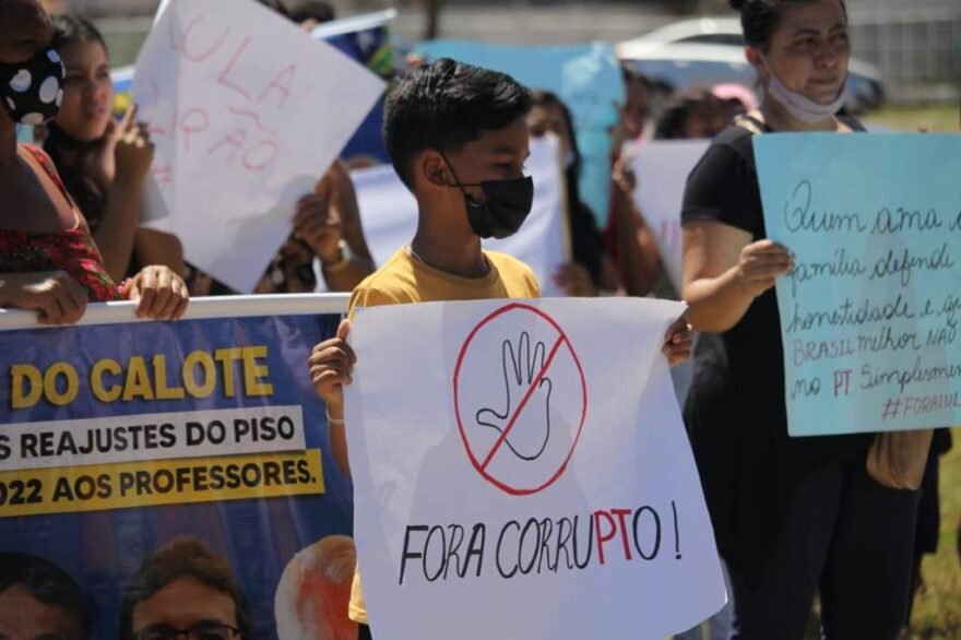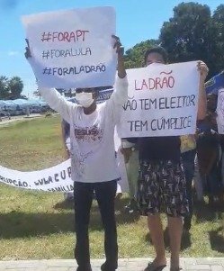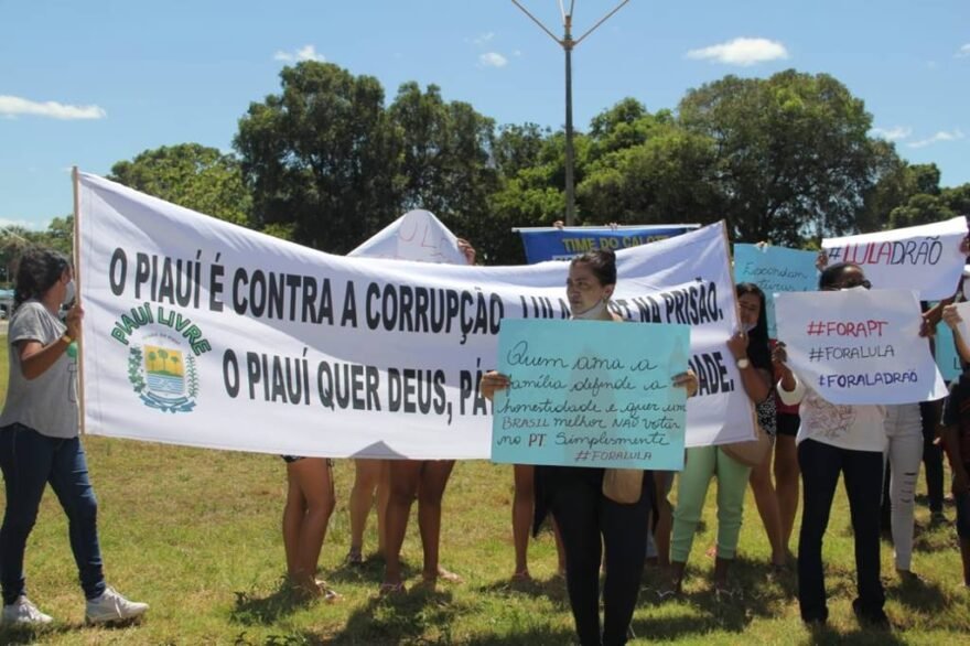 Com cartazes de “Fora PT” , “Fora Lula” e “O Piauí é contra a corrupção”, os manifestantes esperam a comitiva do ex-presidente na saída do portão do aeroporto.