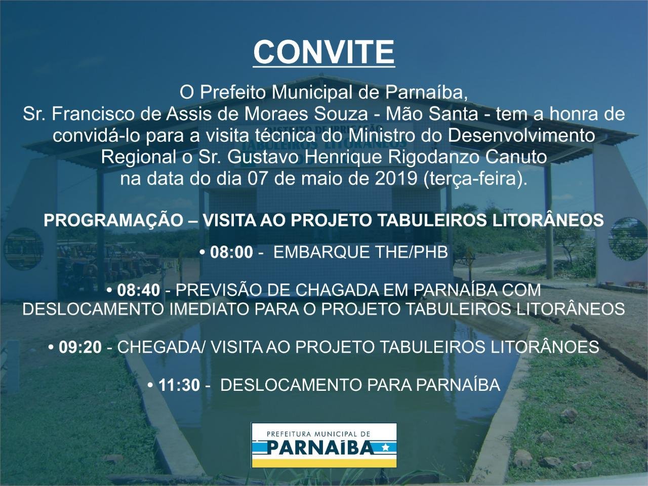 O Ministro do Desenvolvimento Regional, Gustavo Henrique Canuto, chega a Parnaíba na manhã desta terça-feira para conhecer a realidade do DITALPI – Distrito de Irrigação Tabuleiros Litorâneos. É o terceiro ministro do governo Bolsonaro que visita o município, para conhecer as carências do município, numa deferência especial ao prefeito Mão Santa. Antes dele aqui estiveram os Ministros da Agricultura, Teresa Cristina e da Cidadania, Osmar Terra.