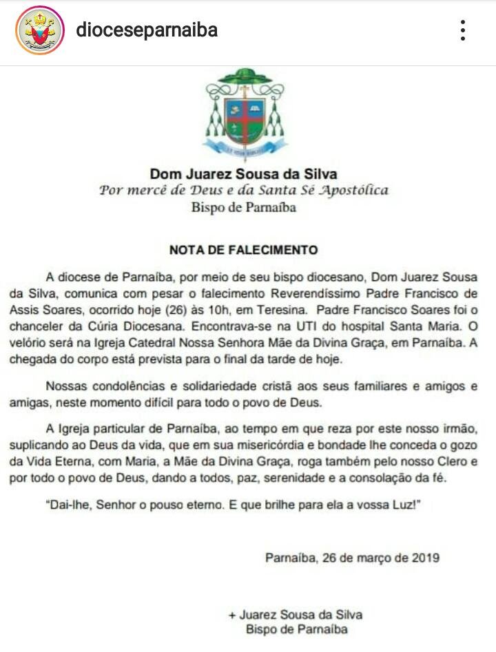 Faleceu na manhã desta terça-feira (26) em Teresina, vitimado por problemas cardíacos, o Padre Francisco de Assis Soares, do clero da Diocese de Parnaíba. A família católica parnaibana está consternada com a notícia.