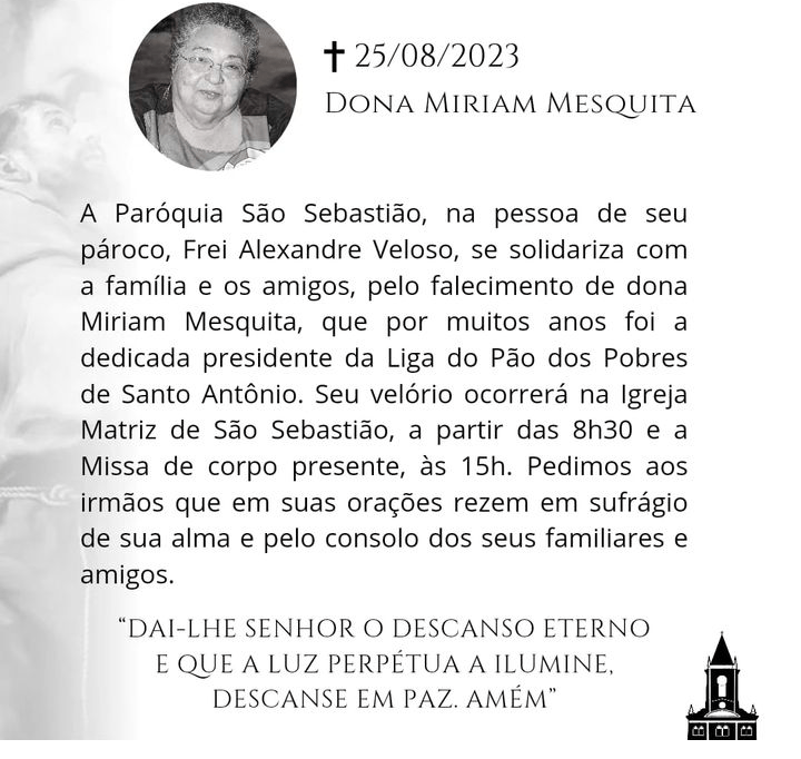 Com imensa tristeza deparo-me agora no Instagram com a notícia do falecimento da grande amiga – minha e da minha família, Miriam Mesquita, que durante muitos anos comandou uma grande obra de apoio aos idosos, na Liga do Pão dos Pobres de Santo Antônio, na Paróquia de São Sebastião, em Parnaíba.