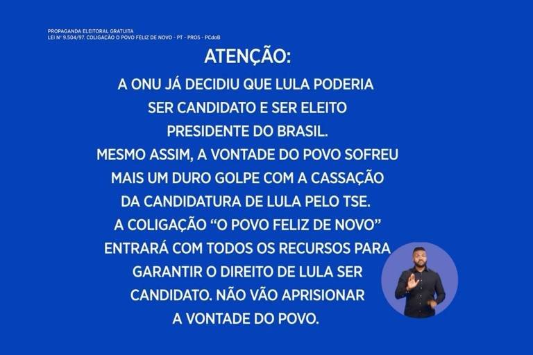 O PT usou o tempo da propaganda na TV neste sábado (1º) para defender a candidatura de Lula, barrada por decisão do TSE. O tribunal também decidiu que o petista poderia aparecer no horário eleitoral, mas não como candidato.