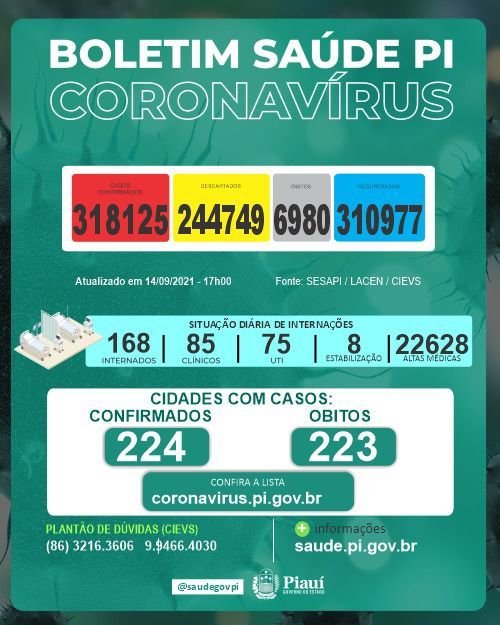 Os casos confirmados no estado somam 318.125 em todos os municípios piauienses. Já os óbitos pelo novo coronavírus chegam a 6.980 e foram registrados em 223 municípios.
