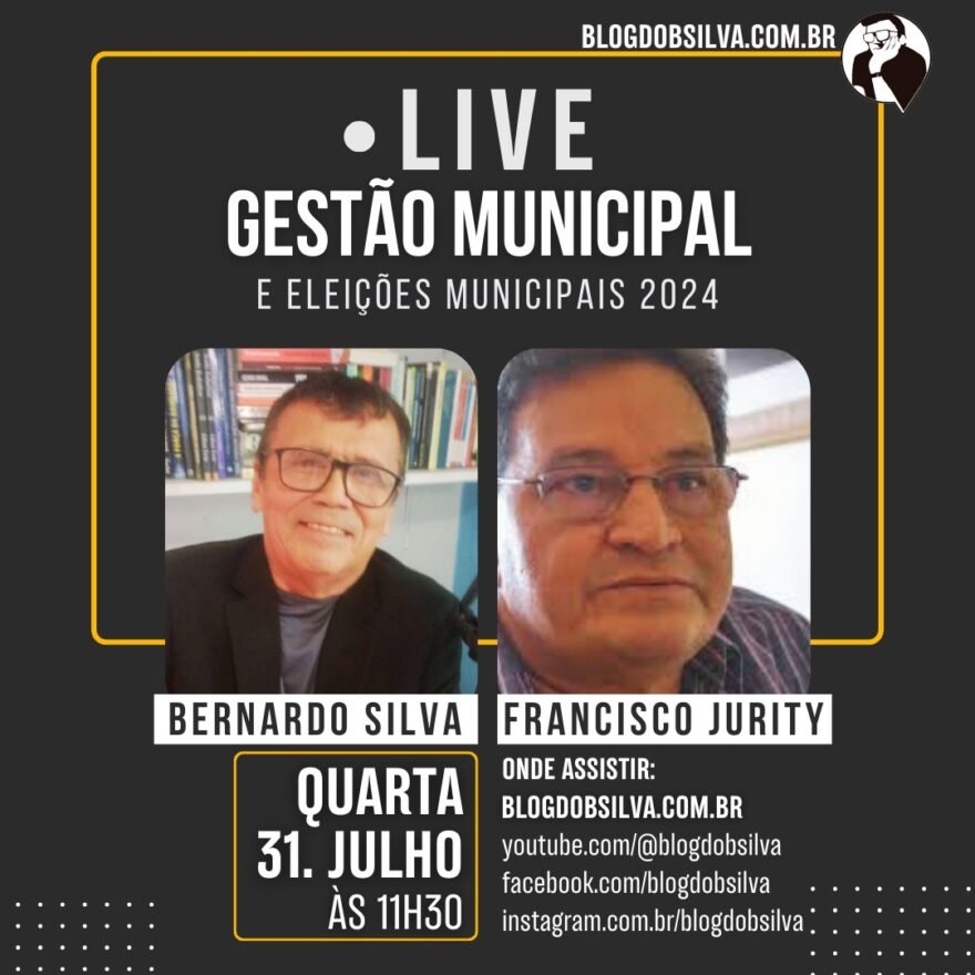 O ex-vereador de Parnaíba, Francisco José Martins Jurity, será o entrevistado da live do blogdobsilva.com.br desta quarta-feira, 31 de julho. O tema será o momento político e também a gestão municipal da qual Jurity tem se revelado um crítico ácido, por não concordar que a prefeitura seja governada atualmente por uma pessoa que não recebeu um voto sequer para ser prefeita. Trata-se da deputada estadual Gracinha Mão Santa, que, segundo Jurity, usurpou o poder das mãos do Pai, o Mão Santa, e faz e acontece na gestão municipal, sem que nenhuma autoridade tome alguma providência.