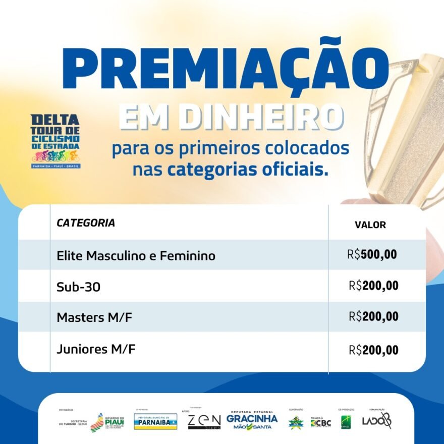 As inscrições estão sendo realizadas no sítio da FCP (www.fcp-pi.esp.br) ou na plataforma de inscrições www.agendaoffroad.com.br. A próxima etapa do campeonato estadual de ciclismo de estrada será o GP Raiz de Ciclismo, no dia 10 de setembro, em Teresina. O Delta Tour de Ciclismo de Estrada tem patrocínio do Governo do Estado do Piauí, por meio da Secretaria de Turismo (Setur), Prefeitura de Parnaíba, Dep. Gracinha Mão Santa. Apoio: Zen Bike. Coprodução: X Brasil; Supervisão: Federação de Ciclismo do Piauí – FCP e Confederação Brasileira de Ciclismo – CBC.