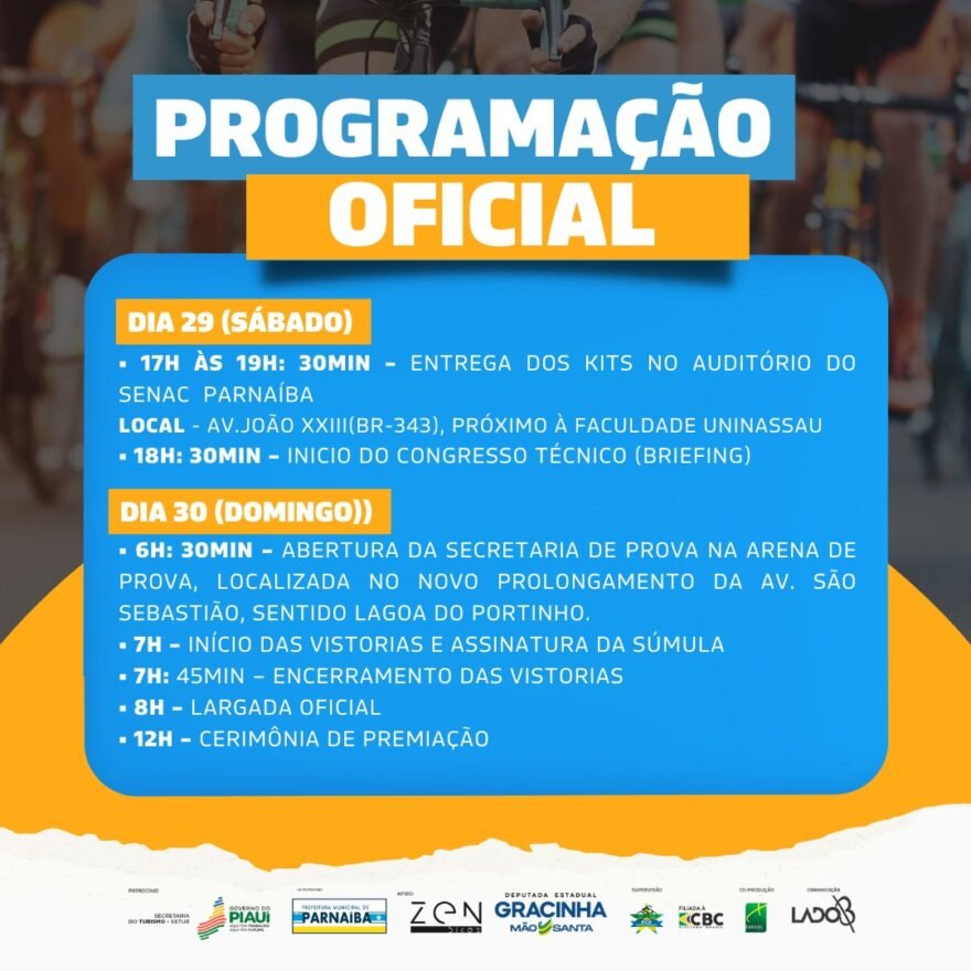 No domingo (30), o evento será no novo prolongamento da Av. São Sebastião, a partir das 6h30, com a abertura da Secretaria de Prova; as vistorias técnicas começam a partir das 7 horas, porque às 8 horas, será dada a largada para a 3ª etapa do campeonato piauiense da modalidade. Os atletas inscritos deverão levar um quilo de alimento não perecível.