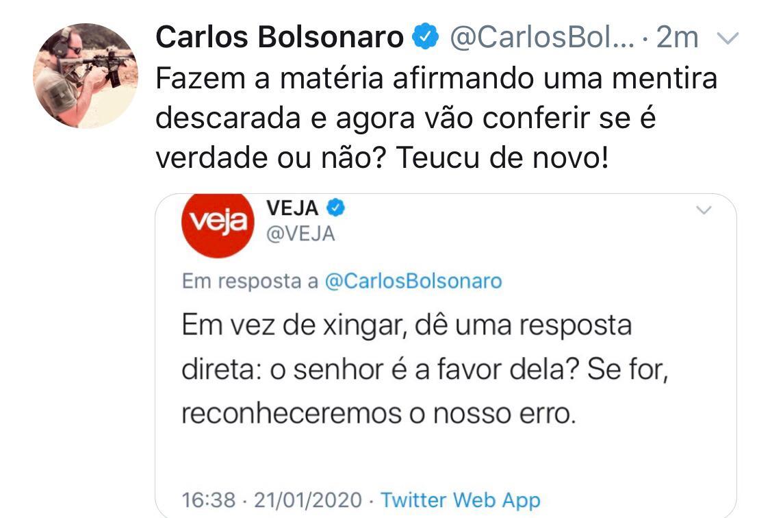 O vereador do Rio de Janeiro, Carlos Bolsonaro, através do seu perfil no Twitter respondeu de maneira inusitada a um tuíte da Revista Veja.