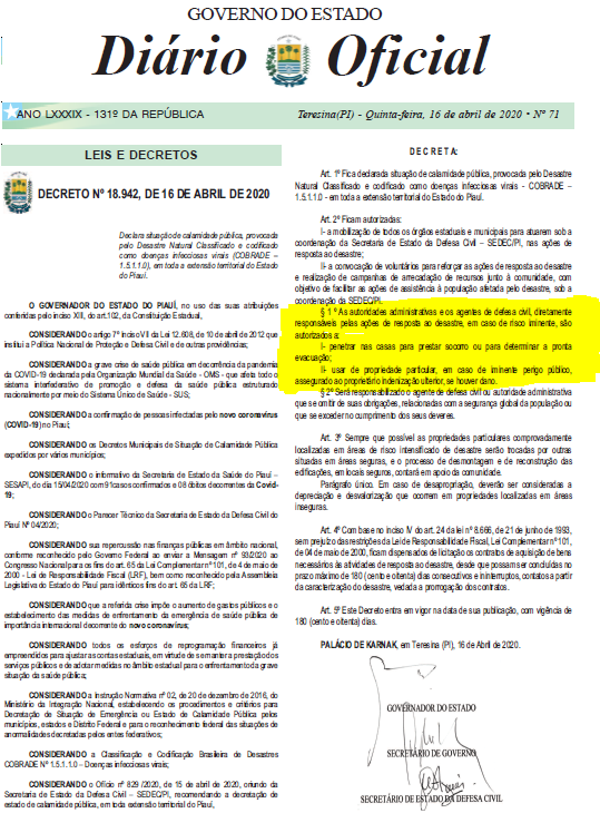 O governador do Piauí, Wellington Dias, do PT, autorizou que agentes da defesa civil ou autoridades responsáveis pelo combate ao novo coronavírus entrem na casa das pessoas “para prestar socorro ou para determinar a pronta evacuação”.
