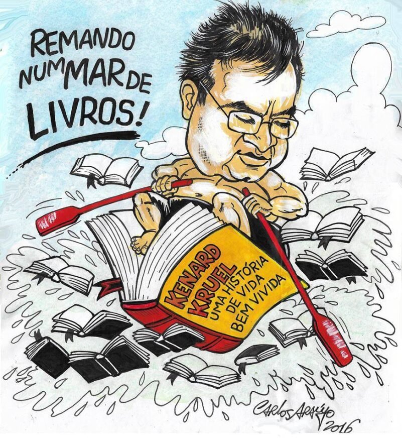 Ainda em Parnaíba, montei o livro de poemas Em Três Tempos – Kenard Kruel, Paulo Couto e Elmar Carvalho, mimeografado, com capa feita na extinta Comepi, em Teresina, pela bondade do artista gráfico Vilson. E não parei mais. Entre poemas, biografias, críticas literárias. fortunas críticas, jurídicos e outros, já se vão quase 40 livros no currículo. Fora os dos amigos e das amigas que editei pela Zodíaco, que fundei em 1987. O cartunista pernambucano Carlos Araújo chamou isto de Mar de Livros, tendo feito, inclusive, esta belíssima obra de arte homenageando o hoje famoso escritor Kenard Kruel.