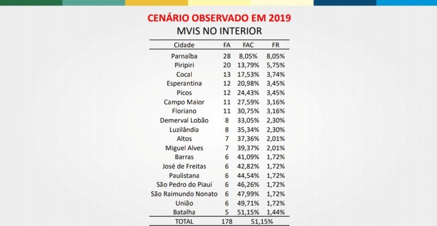 O relatório ainda aponta que 51,15% dos crimes no interior, concentram-se em apenas em 18 municípios. São eles, Parnaíba, Piripiri, Cocal, Esperantina, Picos, Campo Maior, Floriano, Demerval Lobão, Luzilândia, Altos, Miguel Alves, Barras, José de Freitas, Paulistana, São Pedro do Piauí, São Raimundo Nonato, União e Batalha. Veja o ranking!