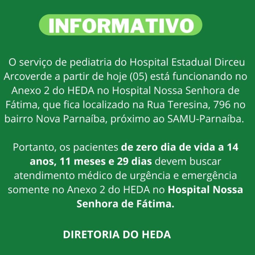 Os serviços de Pediatria do HEDA foram transferidos para o ANEXO II Posted by Bernardo Silva on 5 de setembro de 2022 in Cidade Hospital Nossa Senhora de Fátima (Anexo II do HEDA) atendendo com serviço de Pediatria Cidade