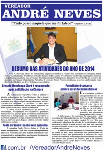 Em virtude de matéria recentemente publicada em seu blog, onde o prezado comunicador se refere aos jornais informativos de vereadores de Parnaíba, texto em que cita que apenas os nobres vereadores Fátima Carmino e Ricardo Veras lançaram publicações, me senti na obrigação de manifestar-me.