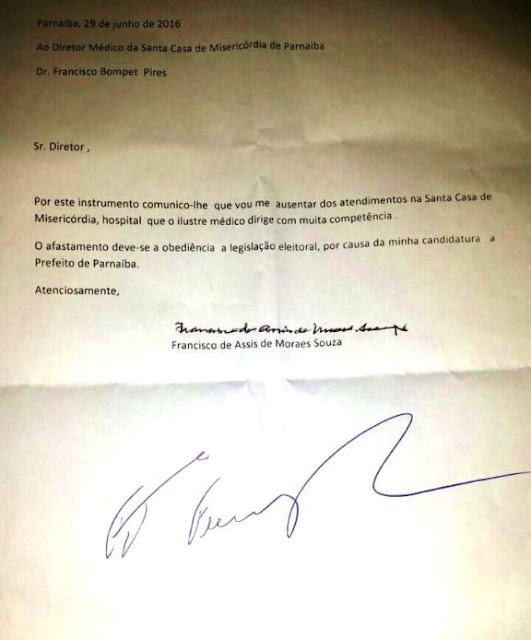 O médico Francisco Moraes Souza, o popular Mão Santa, pediu desligamento nesta quarta-feira(29), de sua função como médico cirurgião da Santa Casa de Misericórdia de Parnaíba, obedecendo a legislação eleitoral.