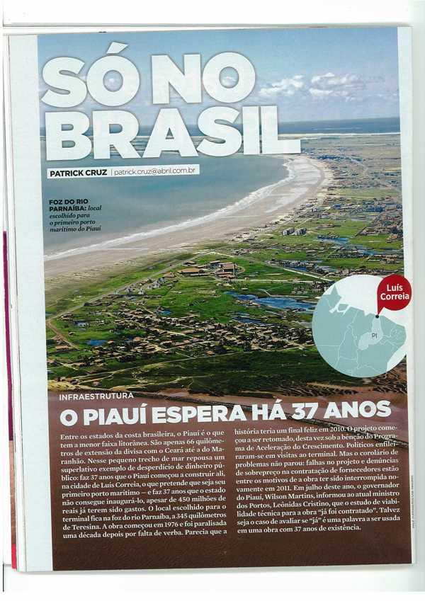 A matéria, assinada por Patrick Cruz, titulada “Só no Brasil – O Piauí espera há 37 anos”, levanta desconfianças sobre os sucessivos anúncios feitos pelos sucessivos governos, e mais precisamente sobre informações do governador Wilson Martins repassadas ao ministro dos Portos, Leônidas Cristino.