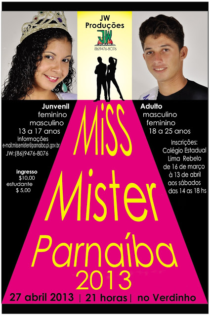 Estão abertas desde o último dia 16 as inscrições para o concurso “Miss e Mister Parnaíba 2013″. Os interessados deverão efetuar sua inscrição no Colégio Estadual Lima Rebelo, aos sábados, no horário de 14:00 às 18:00 horas até o dia 13 de abril de 2013.