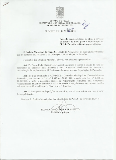 O prefeito Florentino Neto (PT) encaminhou a Câmara Municipal de Parnaíba, Projeto de Lei que concede isenção de taxas de obras e serviços ao Estado do Piauí para implantação da ZPE de Parnaíba.