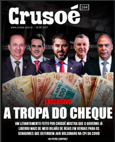 A revista Crusoé traz informação de capa evidenciando que os senadores que defendem o governo na Comissão Parlamentar de Inquérito da Pandemia têm sido agraciados com recursos federais de forma generosa.