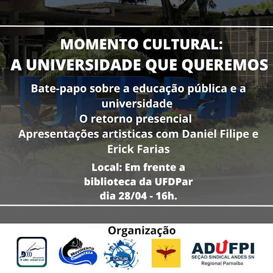 Em continuidade às atividades da Jornada de Lutas e Reposição Salarial Emergencial das Servidoras e Servidores Públicos, docentes e discentes realizam nesta quinta-feira, 28, às 16h em frente a biblioteca da Universidade Federal do Delta do Parnaíba (UFDPAR) um momento político-cultural para debater “a universidade que queremos”.