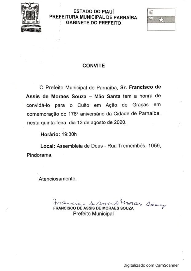 Parnaíba 176 anos: Prefeito Mão Santa convida Posted by Bernardo Silva on 13 de agosto de 2020 in Cidade Cidade