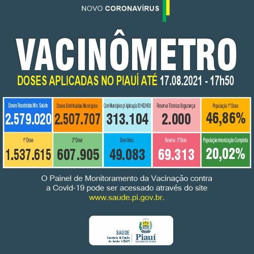 Os casos confirmados no estado somam 313.928 em todos os municípios piauienses. Já os óbitos pelo novo coronavírus chegam a 6.915 e foram registrados em 223 municípios.