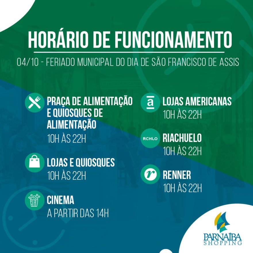 Confira o funcionamento do Parnaíba Shopping no feriado municipal do dia de São Francisco de Assis, no dia 04 de outubro. Para maiores informações, o Parnaíba Shopping Center está à disposição por meio de suas mídias sociais e no telefone (86) 3315-6500.